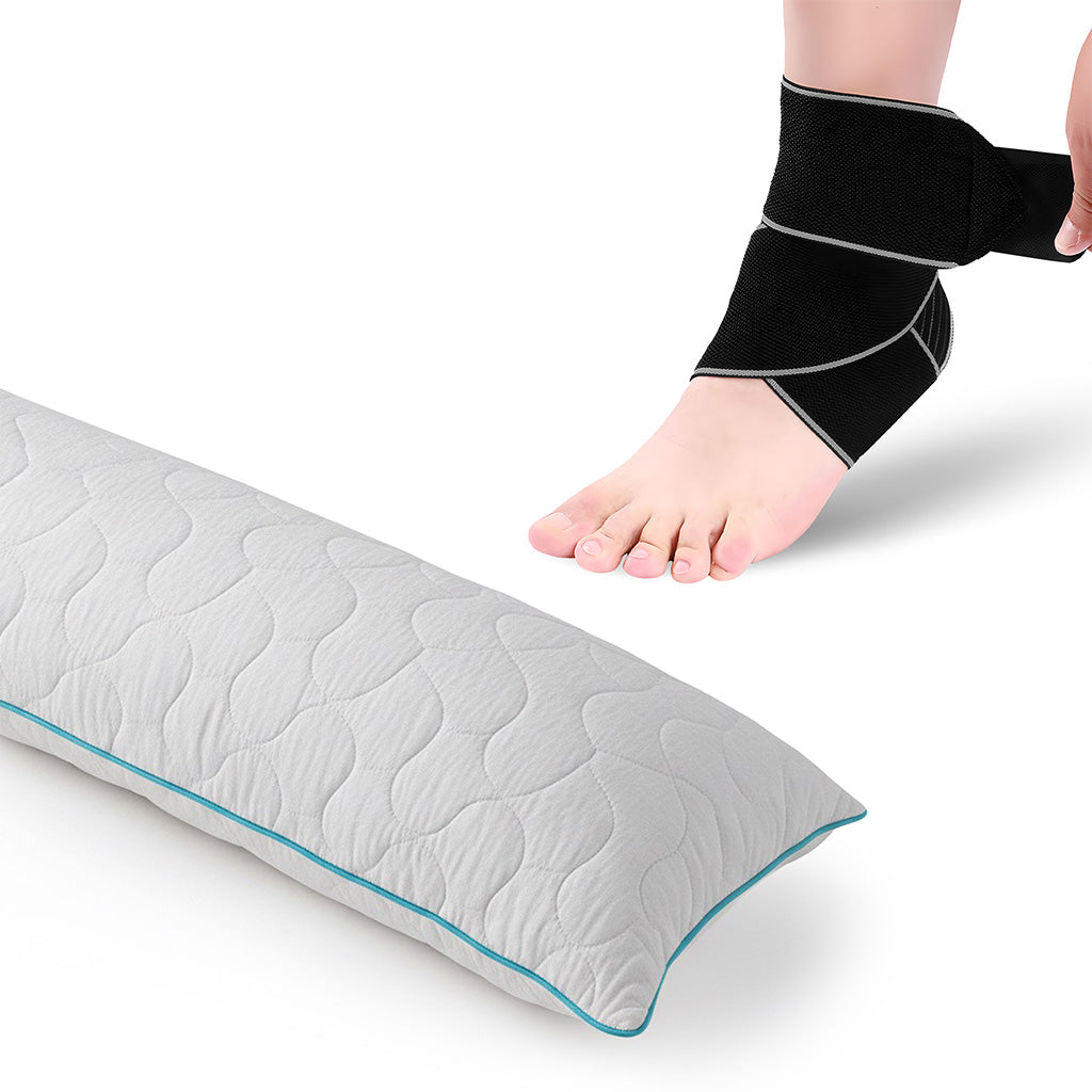 Ziehe die Bandage über den Fuß und fixiere die Riemen so, dass ein angenehmer, fester Druck entsteht, ohne die Durchblutung einzuschränken. Platziere das Kissen in der Seitenlage zwischen deinen Knien, um Hüfte und Rücken optimal auszurichten.